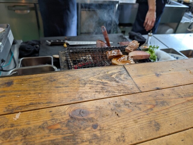外においてますバーベキュー用の釜で8時間炙ったホロホロ肉。これはサービス。