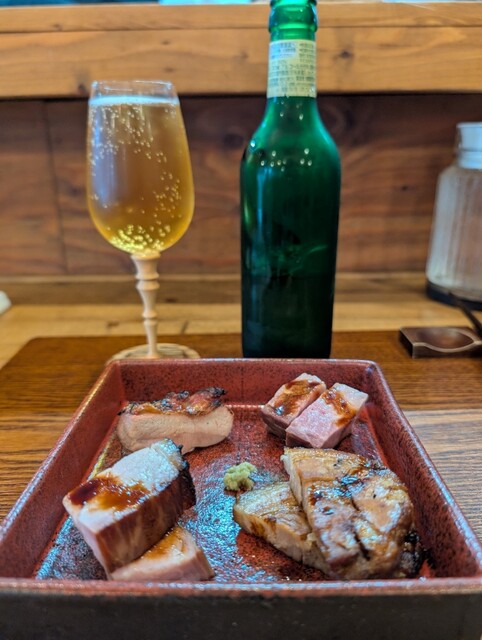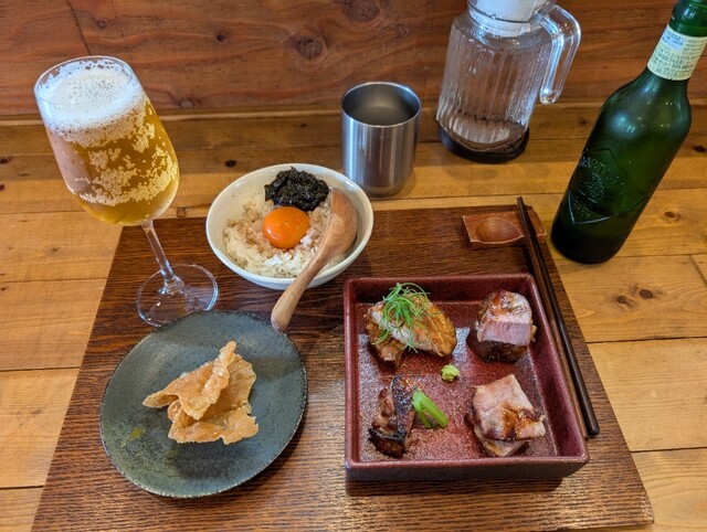 塩ラーメンも普段食べていないのですが、優しい味で美味しく感じるので選択してしまいます。本当はこの後につけ麺も行きたい所なんですが、一度塩ラーメンの後に頼んだのですが流石にお腹が膨れて味がよく分からなかったです。なので、今回も最初は特製塩ラーメン、次に名古屋コーチン卵かけご飯、そしてチャーシュー皿にビール小瓶となりました。車で来られる方は飲めませんね。残念。塩ラーメンで使用している鶏肉は東京軍鶏だそうです。