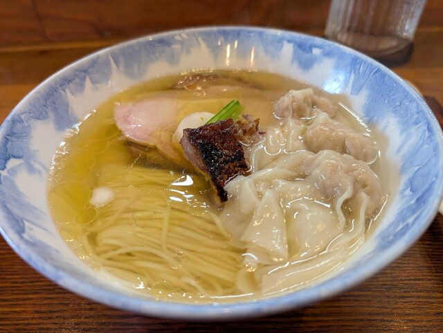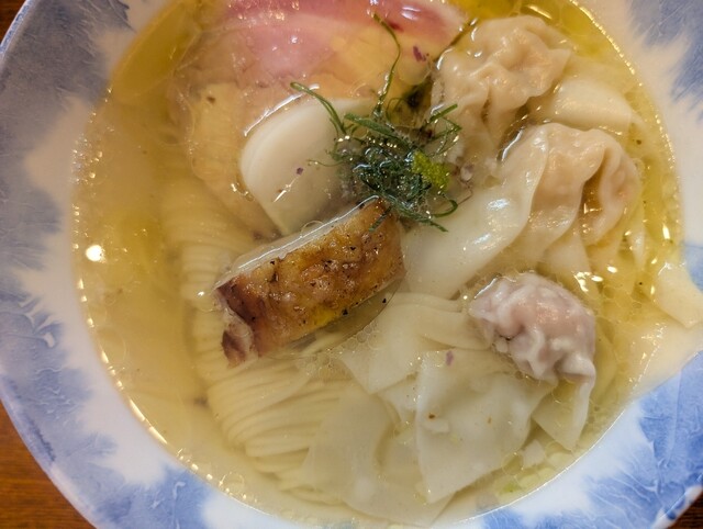 特製塩ラーメン。2種類の雲呑と何種類かのチャーシューがトッピング。