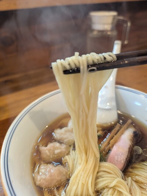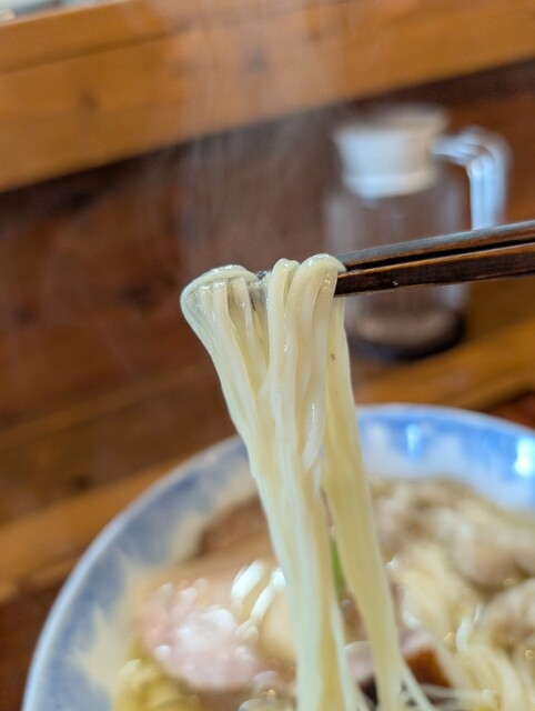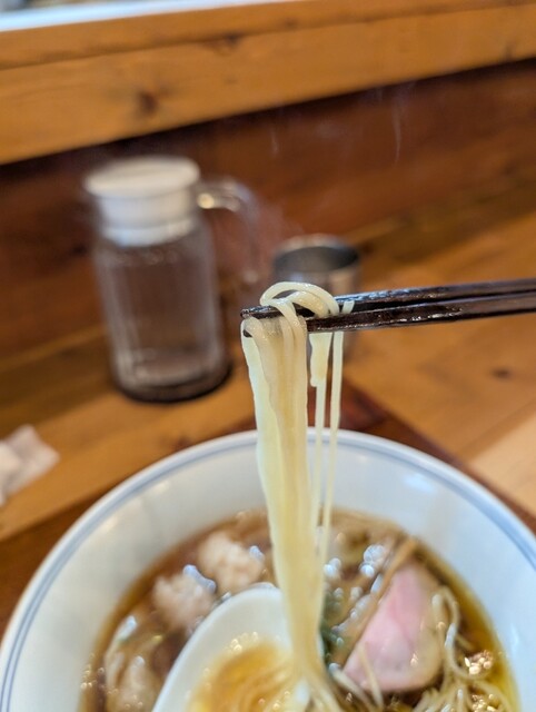 透き通った細麺。平麺なんですよね。丸くないです。
