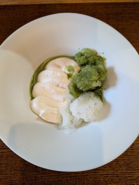 この日は14時半予約で14時ちょっとに着きました。2階の待合室で少しだけ過ごしました。ほぼ時間通りにポケベルで呼ばれてお店に入りました。奥様にカウンターに案内され席につきました。店主はいつもと同じくテキパキと動きまくってます。あれ?スタッフさん、増えたかな?見たことない男性スタッフがいらっしゃいました。営業時間短いので、集中してお客さんが出入りするので忙しいのでしょう。