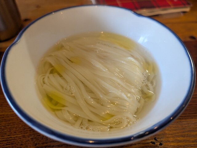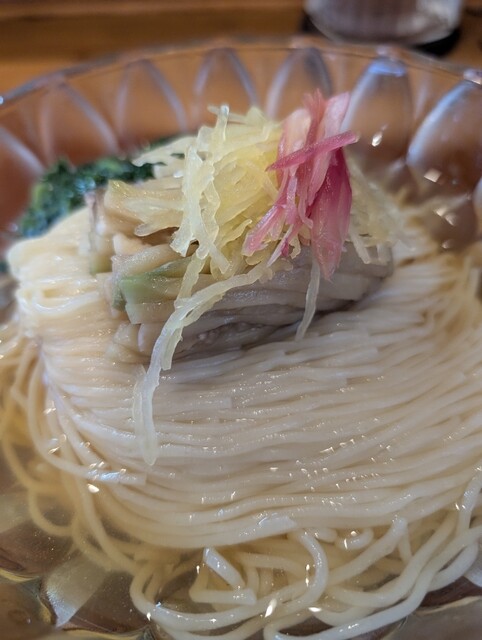 透き通るような細麺、舌触りの良さは格別です。