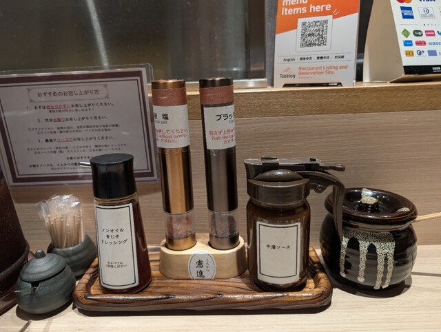 岩塩、胡椒、ドレッシング、ソース、からし。