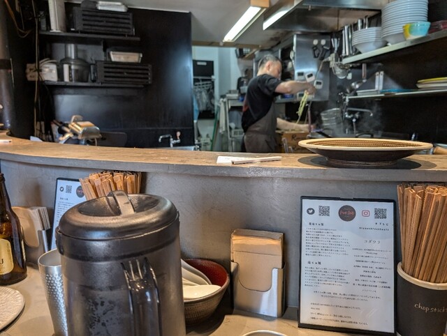 一口目、少し塩っぽいかな!と感じた瞬間にしじみが口の中を占領しました。おっ?これは凄いパンチ力、前回の醤油とは全然違う。全く大人しくないです。旨味の強さに圧倒されます。『宍道湖しじみ中華蕎麦琥珀』よりもストレートに訴えかけるスープでした。次に来たのは地鶏でした。上品でもあり、飽きの来ないスープでした。麺は硬めに茹でられていて細麺ではかなり珍しいしブレを抑えるが難しそうです。実際先週食べた麺よりも少しだけ柔らかく感じました。麺を茹でてから二つの器に両手を使って同時に麺を入れるという離れ業をされてました。そこに集中力が使われていて麺の硬さのstabilityは大丈夫なのかなぁと少し思いました。先週に醤油を食べたときは、十分煮え切れていないときの硬さを感じました。勿論、博多ラーメンのバリ硬や粉落としのレベルではありませんが芯が残っていました。このお店はお二人のオペレーションで柳瀬店主は戦場にいるが如く動き回っています。見ていて滅茶苦茶大変そうです。その中で二刀流で二杯同時に作業を行うに至ったのかも知れません。