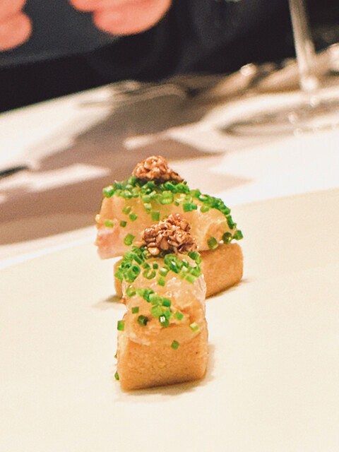 ○ヒラメととあん肝、刻んだシブレット(ヨーロッパのネギの一種)とコリアンダーのひとつまみ料理