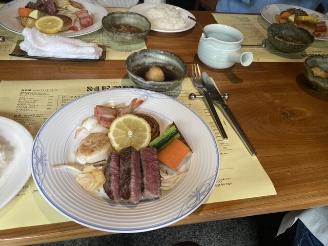 場所は市電の運動公園前駅から公園内を通り抜けて300m程の真裏に位置します。叔父が95歳なのでランチ(因みに今日も完食)です。従兄弟により、予め注文は済まされており4人共、黒毛和牛80g、海老、帆立6,300円をミデアムレアで頂きました。夜はガストライトクラブ12,300円を決まって食べるそう。