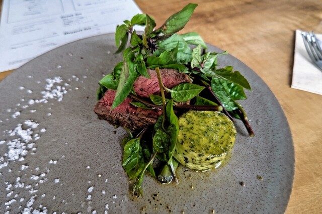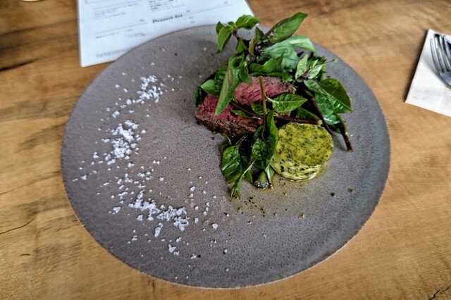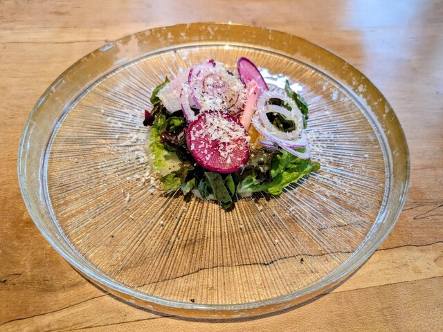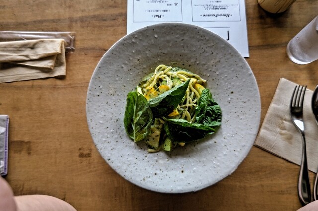 パスタは牛テールとごぼうのラグーソース、メインはアンコウのフリットのコースをいただきました。