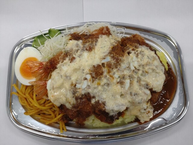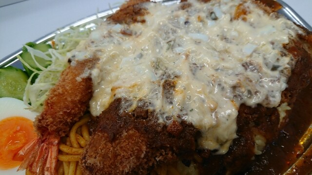 手際が良いので、程なくして提供されました。最後に、目の前で、店主さん!?が、タルタルソースを盛り付けてくれて、完成です。たっぷりのタルタルソースですが、大盛りのタルタルソースにすると、どうなるんでしょ!?。このタルタルソースが絶品なのです。いかにも美味しそうなビジュアルです。いや、美味しくないはずがありません!!ベジファーストで、キャベツの千切りから戴くのですが、このブラウンソースに浸けて戴くと、美味しいんです。そして、付け合わせのナポリタン!?を戴くんですが、コチラも、ブラウンソースに浸けて戴くと、より美味しいです。付け合わせのゆで卵とキュウリは、途中でそのままで戴くと、サッパリして、良い箸休めになります。