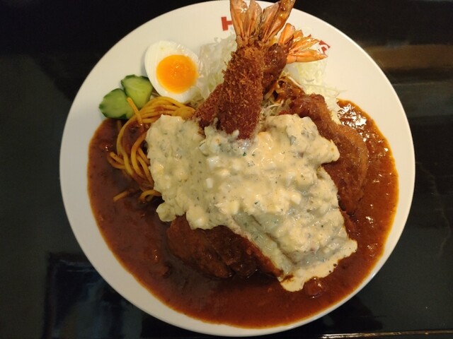 いよいよ、主役のトンカツに行きます。筋切りもしっかりしてあるんでしょう、とっても柔らかくて、美味しいです。脂身好きの私は、脂身多目にして正解でした。この脂身が、甘くて、このソースともよく合うし、ご飯が進む、進む。ちなみに、ご飯(サフランライス!?)は、盛り付けられたカツなどを退けると、お目見えします。続いては、エビフライ。2尾乗ってますが、コチラが、また、美味しいんです。とにかく、エビの身がしっかり締まっていて、食べ応えあるんですね。私、色んなところで、エビフライを戴いてますが、コチラのエビフライ、とっても大好きです。なら、エビトルコ(エビフライのみのトルコライス)でもいいんじゃない!?って話なんですが、トンカツも捨て難くて(^_^;)。