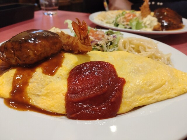 オムライスに乗っているハンバーグも、ミニサイズではなく、しっかりと一人前あります。手作りで、どちらかといえば、ふわふわの仕上がり。ハンバーグを割ると、肉汁が溢れてくる仕様です。デミグラスソースも、手作り感があって、ブラウンソースの風味がしっかりとしています。側に鎮座しているエビフライは、揚げ具合が素晴らしく、衣はサクッと、エビはふんわりの仕上がりで、タルタルソースに付けると、めちゃめちゃ美味しいです。