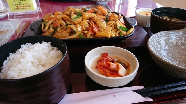 はじめ、お連れさんがオーダーされた、ステーキが運ばれてきたと思ったら、私のホルモン焼きうどんでした。油はねしないように、紙のついたて?付き。この、熱々鉄板でジュージュー言っている時点で、もう、たまりませんね。しかも、副菜でキムチ、デザートまで付いている!この内容で、追加料金¥200って、素晴らしい!ちなみに、ステーキは、なんと追加料金なし!