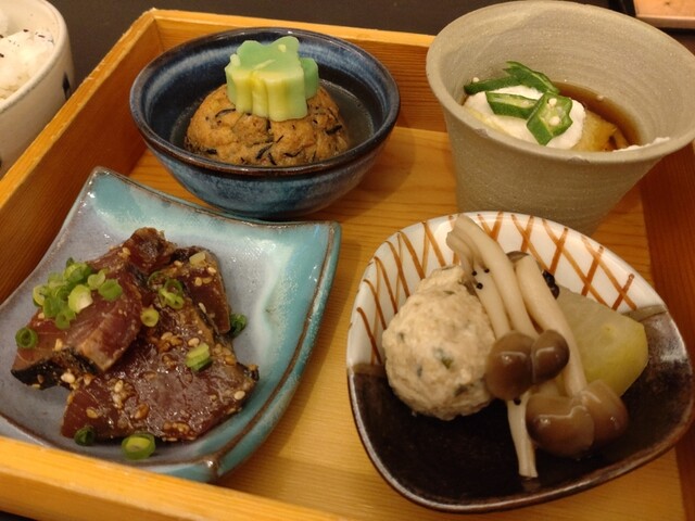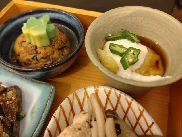 まず、お漬物の小皿が提供されたのですが、この盛り付けのセンスに心踊らされました。ちょっとしたことなんですが、とても期待せずにはいられない気がしました。そして、重箱が提供されました。この瞬間、確信しました。間違いなく美味しいですね~と。料理は、左上から、がんもの煮付け、茄子の煮浸し、つみれ団子と冬瓜の煮付け、カツオの胡麻醤油あえ。