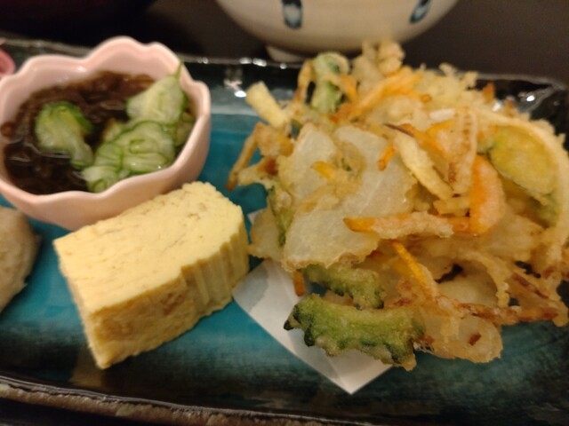 玉ねぎ、人参のほかに、珍しいところで、ゴーヤが入っています。私は、ゴーヤが苦手なのですが、このかき揚げに関しては、美味しく戴けました。玉ねぎの甘みに、ゴーヤの苦味が良いアクセントになるんですね。なるほど。揚げ方も、素晴らしいです。外はサクッと、中はふんわり。