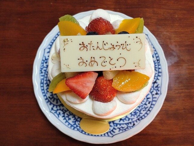 バースデーケーキを、前回もお願いした、こちらのお店へ。予め電話で予約しましたが、前回と同じものをお願いしようとしたところ、今年は暖冬で、国産のイチゴの収穫が少ないらしく、やってないとのこと。代替え案で、フルーツ山盛りの4号デコレーションケーキ¥2,900をお願いしました。当日、取りに行ったら、確認のために見せてくれるのですが、いや、やっぱり、盛りつけがすごいのなんの!楽しみにして、テイクアウトしました。