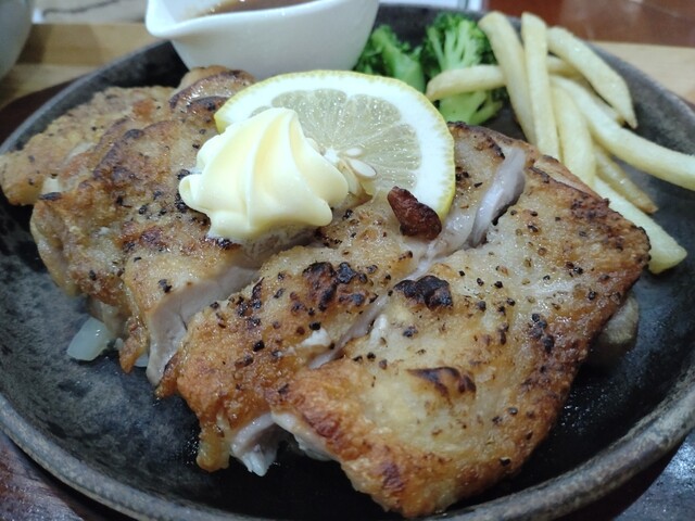 バイキングで嬉しいのは、新鮮な野菜を戴けること。そして、カレーは、レトルトベースだとは思いますが、美味しいです。でも、少し、ソースの味が強めでした。ご飯は、特筆すべきはありませんが、炊きたての温かいご飯は、嬉しいですね。で、ココまでで、結構、お腹いっぱいになってきました(笑)。そうこうしていると、チキンステーキが登場。鉄板の上で、ジュージューと、いかにも美味しそうなビジュアルです。早速戴いてみると、調理がとてもお上手で、美味しいです。火の入れ具合も絶妙で、鶏肉の旨味を犠牲にせず、柔らかく仕上がっていて、とても美味しく戴けます。ソースは、シャリアピンソースのタイプですが、ホイップマーガリンが、いい仕事してて、まろやかなコクをプラスしてます。そして、モモ肉1枚の、素晴らしいボリューム。