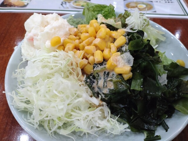 さて、お楽しみのランチですが、私、初めてでして、バイキングがあるんですね。バイキングメニューのみなら、追加料金無し。バイキングは、生野菜色々、カレー、ライス、パン、デザートとなっています。今思えば、バイキングだけで良かったかも!?でも、せっかくならと、何かおかずになるものをオーダーしようと思っていたら、店員さんから、お声掛けが。「きつねうどんを付けても、追加料金有りませんので。」なんと!!この言葉に誘われてオーダーしたメンバー約1名(笑)。オーダーは、タブレットです。さらに誘われるかのように、ラーメンをオーダーした者が約2名(笑)。残る私は、限定15食で残り1食、表示のタブレットメニューに惹かれて、チキンステーキ¥460をお願いしました。