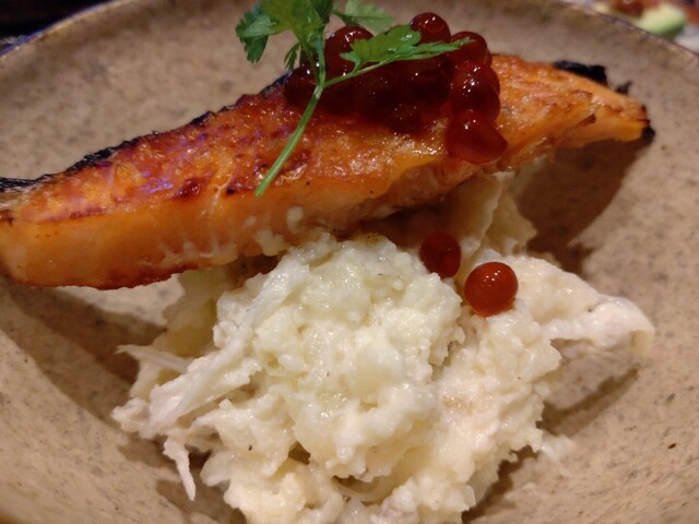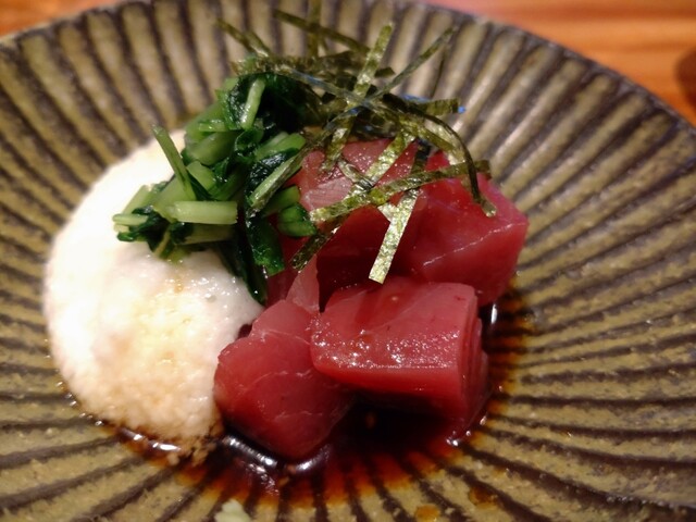 コチラで使用されるマグロは、本マグロでは有りませんが(名前は忘れました)、その味わいは、本マグロを凌ぐものだと思います。こちらの山かけは、壬生菜を添えるという一工夫なのですが、これが、また、よく合うんですね!
