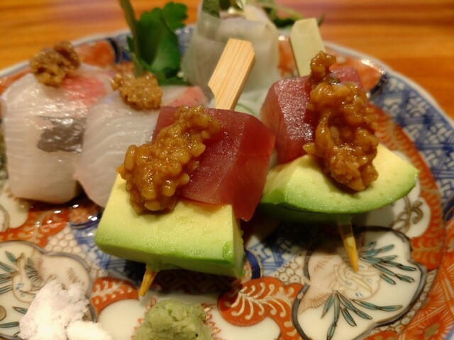 コチラで提供される料理は、どれも一捻り、一手間かかったものばかりなんですね。この盛り合わせにしても、マグロとアボカドを串に刺して、もろみを添えています。これ、とっても合います!!カンパチには、手造りの味噌。コレも素晴らしい!!大根の桂剥きでサバと薬味を巻いたもの、味のまとまりが素晴らしい!!