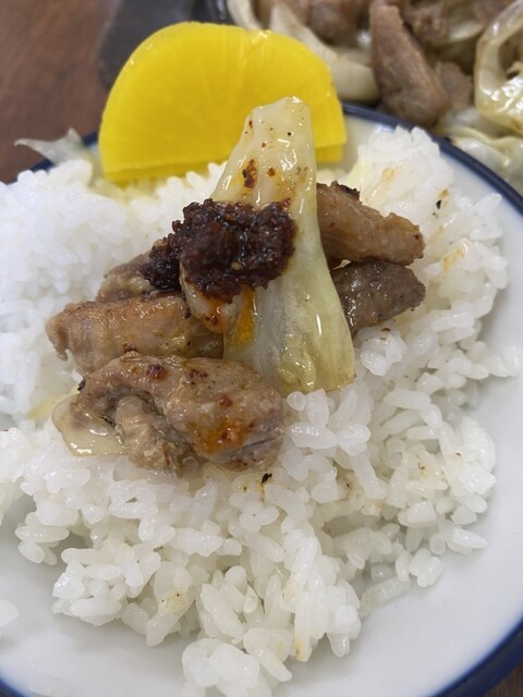 うわっすごいパンチ力‼️鉄板を傾け木の棒を挟み、反対側に流れる旨味と油に辛味噌を溶かす。柔らかい豚肉とキャベツ!コレは昇天します(o ꒪Д꒪)ゥマ