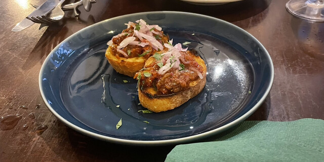 ブルスケッタに生しらすを乗せるという奇抜なその発想がセンスを感じる。