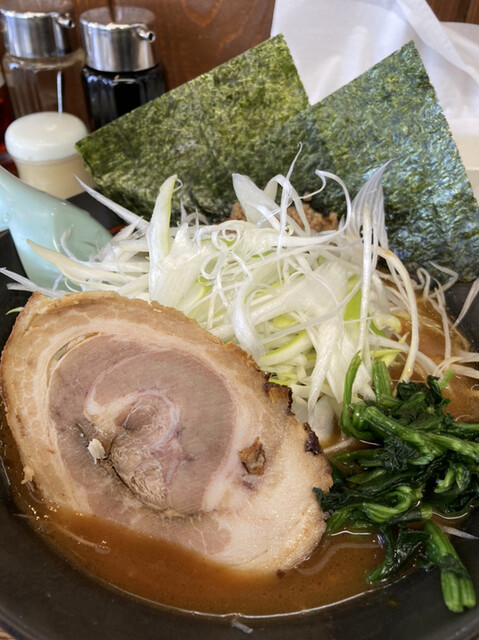 赤味を帯びたねぎとロールチャーシューが1枚のる