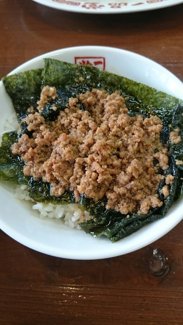 海苔と一緒に食べ進め途中でひき肉をスープに解放!