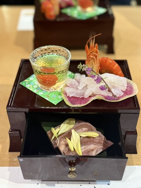・前菜百宝箱(叉焼・エビの紹興酒漬け・クラゲ・トマト)
