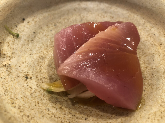 ヨコワマグロ 黄味のソース タマネギと一緒に