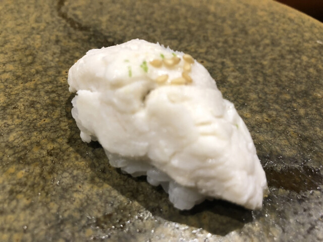 火が入った牡蠣の握り。大将はあまり貝類は握らないらしい。