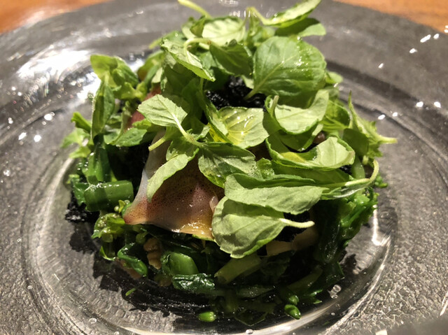 ホタルイカに合わせた苦味のある山菜が、お刺身でのワサビの様な役割をしてくれて、ホタルイカが全く生臭くありません。複雑な味わいですが、山菜の強めの香りがホタルイカを包み込んで爽やかな一皿です。