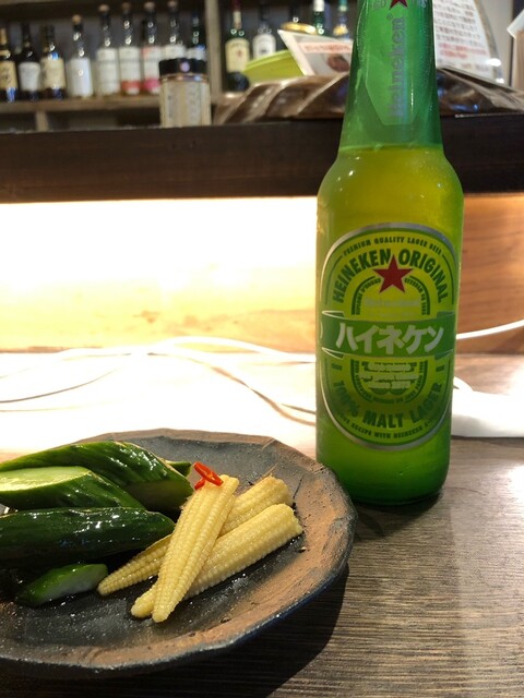 生ビールを注文。お通しはいつも店主さんが手の込んだ料理を作ってくれるので毎回それを楽しみにしています。今回はどてかソーセージに白菜などを和えたもので相変わらず美味しかったです。
