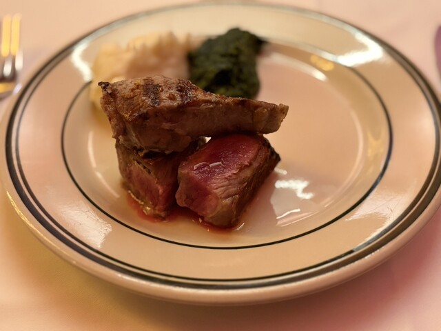 1品目はシーザーサラダ。シャキッとしたレタスが美味しいです。メインのTボーンステーキはサーロインとヒレ。さしは少なく、脂っぽく無くてとても美味しい。逆に黒毛和牛はサシが強く、とろける肉質ですね。マッシュポテトとクリームレスクリームスピナッチとの相性も最高!