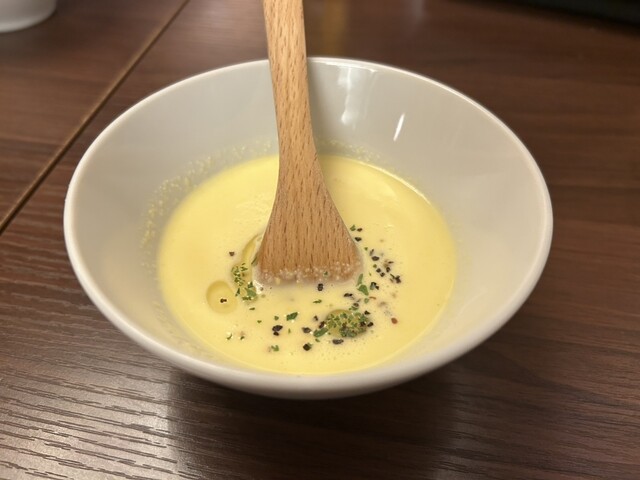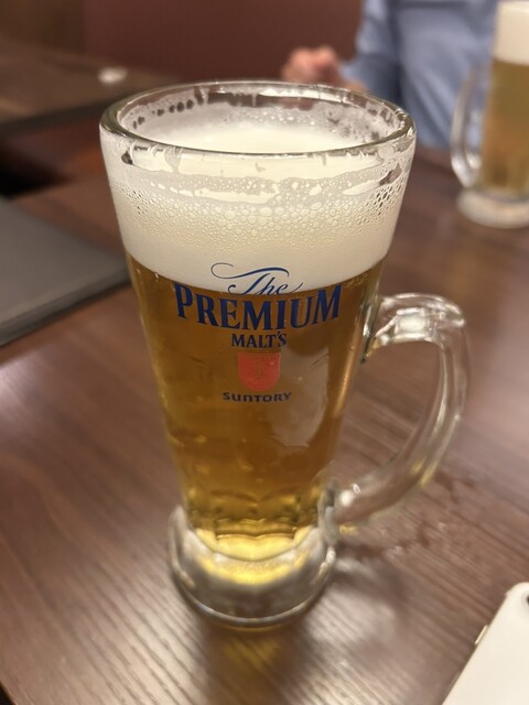 アメリカより一時帰国の同僚とのご飯です。同僚はもつ焼きが好きなので、北新地たゆたゆを予約して訪問しました。ビルの一階ですが、店に入ると昭和な雰囲気。今回は6名での利用の為、入り口付近のテーブル席を利用させて頂きました。先ずは生ビールで乾杯!お通しは冷製スープです。