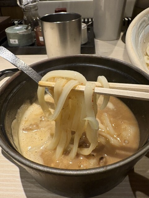 こちらの麺は“無かんすい麺”のため、白くて見た目はうどんのよう。まずこのビジュアルが印象的です。つけ汁は鉄鍋で提供され、鶏×魚介の旨味がしっかり出た濃厚タイプ。モツは甘味があり、つけ汁との相性が抜群。