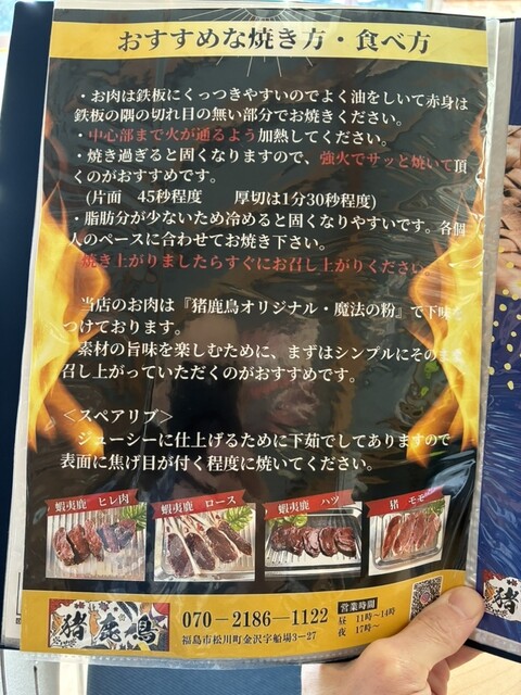 福島市にあるジビエが食べられるお店、猪鹿鳥さんを訪問しました