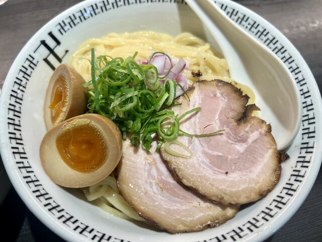 自分はつけ麺大盛。息子はスパイスパクチーラーメン。本店ではテイクアウトしか無いつけ麺がここ行徳店では店内で食べられる。