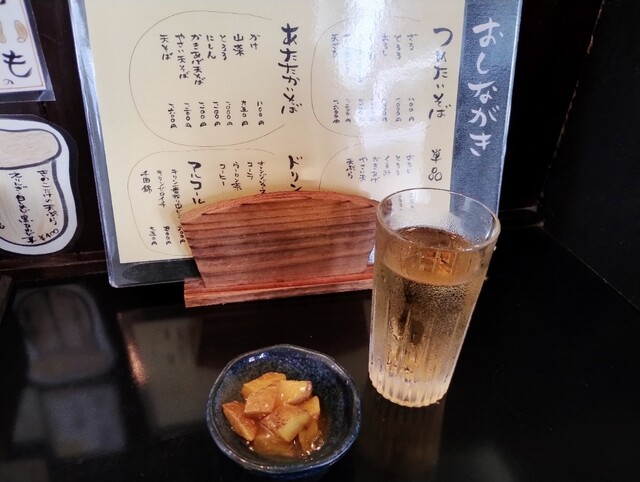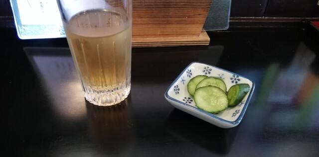 前は、揚げ蕎麦がおつまみに出て来ましたが、今日は胡瓜の漬物でした。
