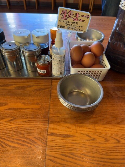 テーブルには生卵が常備してあって無料。これは人生ではお馴染みの嬉しいサービスですよね。私はラーメンに入れてすき焼き風で食べるのがオススメです。また卵かけご飯用の醤油もあるので、ごはんにかけて食べることもできます。