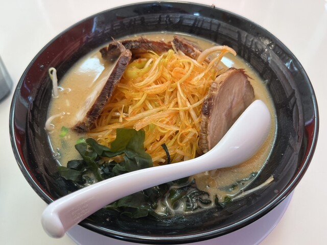 ねぎ味噌チャーシューは、創業以来の変わらぬ仕込みと秘伝の香辛醤油が味噌に加えられた濃厚でコクのある美味しいスープで、にんにくもかなり効いています。麺は日清製粉の小麦粉を100%使用した太めの縮れ麺。具材はたくさんのネギとモヤシ、ワカメなど。そしてチャーシューは4枚にしました。