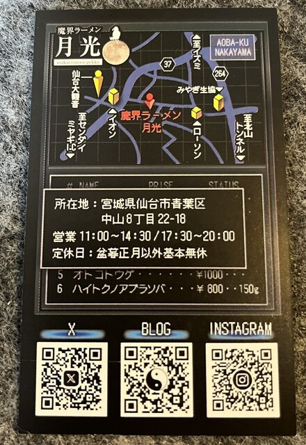 こちらの「魔界ラーメン 月光」をはじめ、泉区明石南にある「暗黒中華そば 雷電」と、多賀城市にある「豚ソバ妖怪 飛燕」が系列店なんですよね。三麺拳グループです。私もつい最近ですが、3店舗とも行っています。ただまだ食べてないメニューもたくさんあるので、まずは月光さんに再訪問です。