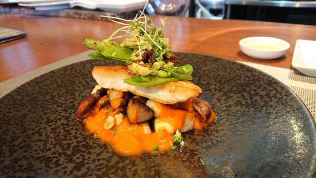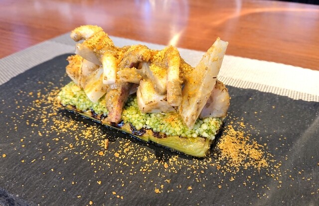 茄子の上には「パセリオイル」を染み込ませたクスクスがまぶしてありました。その上にヤリイカなどの魚介が芸術的に並べてあり、全体に「カラスミパウダー」がふりかけてある一品。見た目でもやられてしまうし、パセリオイルのしみたクスクスの粒々感が魚介類の味や茄子の旨味を引き立てていて、美味しかったです。