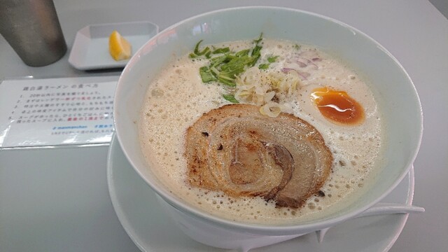 入口には、「豚ガラ、鶏ガラ、人柄」と大きく書かれたのれんが目を引きます。そのよこには小さな券売機、入店前にメニュー選び済ませるシステムでした。