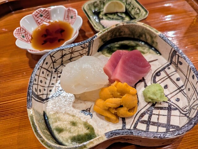 ・北海道産 ウニの刺身: 天草産の新鮮な伊勢海老のこぶしまめやとマグロ、北海道産の濃厚なウニを盛り合わせ。それぞれの素材が持つ、とろけるような甘みや旨味を堪能できます。