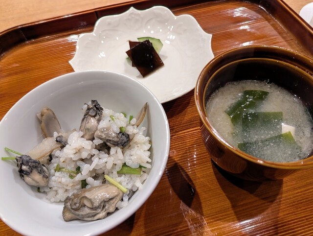 牡蠣の土鍋ご飯と味噌汁漬物