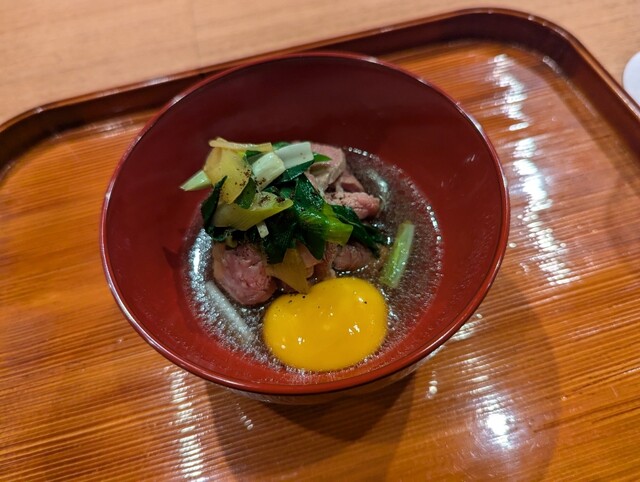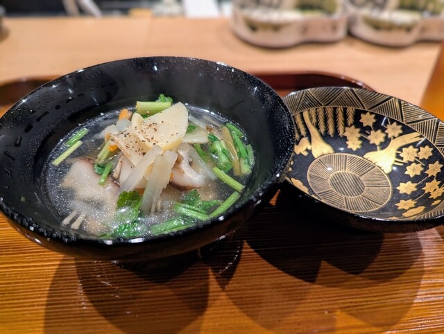 ・ 大根や人参などの野菜を細く切り揃え、シャキシャキとした食感を残して仕上げてあります。皮目を香ばしく焼き上げた肥後赤鶏の旨味が溶け出した、心温まる一品でした。