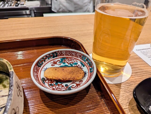 ・店主自ら目の前で炙った生のからすみは、香ばしい香りと濃厚な旨味が口の中に広がります。酒のあてにもピッタリの味わいでした。