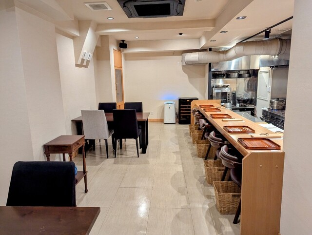 店内は開放的でシンプルなつくり。カウンター席前のオープンキッチンは美しく整頓され全てが見通せます。