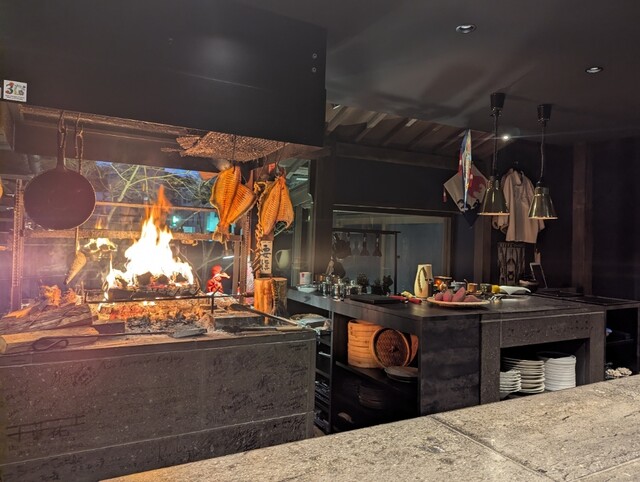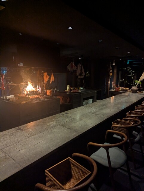 気づけば店内は満席。黒を基調とした空間で、薪火の爆ぜる音を聴きながらいただく「作品」のような料理の数々。