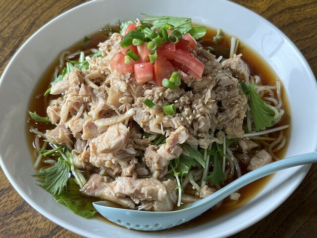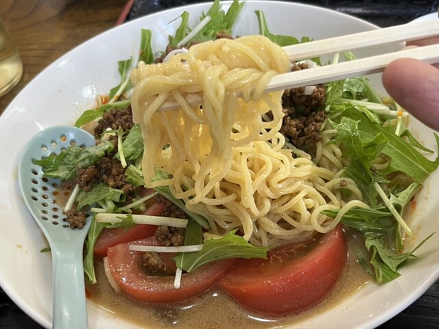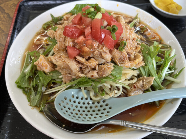 7月日曜お昼前、帰省した娘と息子に話をしたら食べたいとコチラ、香妃さんを突撃。店内潜入し、小上がりテーブルに座り、子供たちはよだれ鶏の冷やし中華1,280円、おじさんはうま辛雲白肉の涼麺1,580円を麺大盛+150円とW餃子950円にてオーダー、15分弱で餃子から配膳スタートして目当てのよだれ鶏の冷やし中華とうま辛雲白肉の涼麺が到着。冷やし中華を口にした瞬間に娘と息子から「うまっ!」を頂きました♪おじさんも涼麺を口にして「うまっ!」を連発。先日食べたばかりだけどマジ美味いです。おじさんオススメ、ごちそうさまでした。