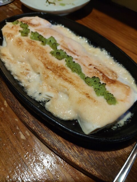 ワサビ軍曹豆腐。鉄板で豆腐のうえに明太マヨネーズをかけ、ワサビを乗せて蒸焼きにしたもの